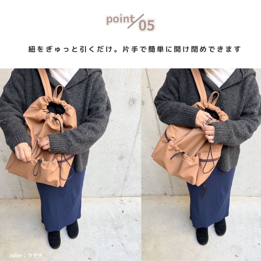 ふんわりとやわらかいシルエットに、ほんのりモードな巾着デザイン。