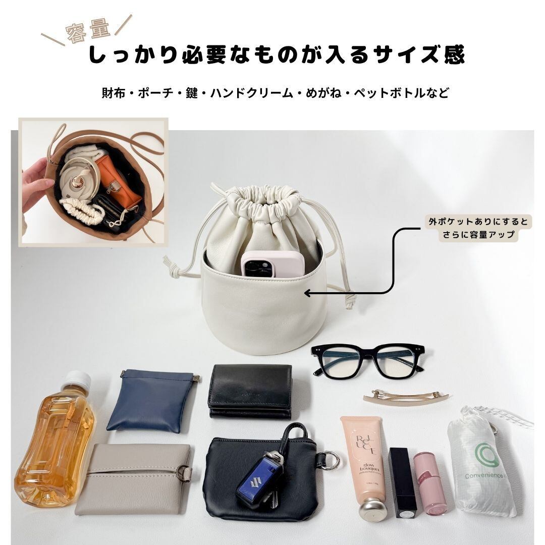 やわらかなフェイクレザーと、ふんわり丸い底のフォルムで、持つだけでコーディネートを格上げします。