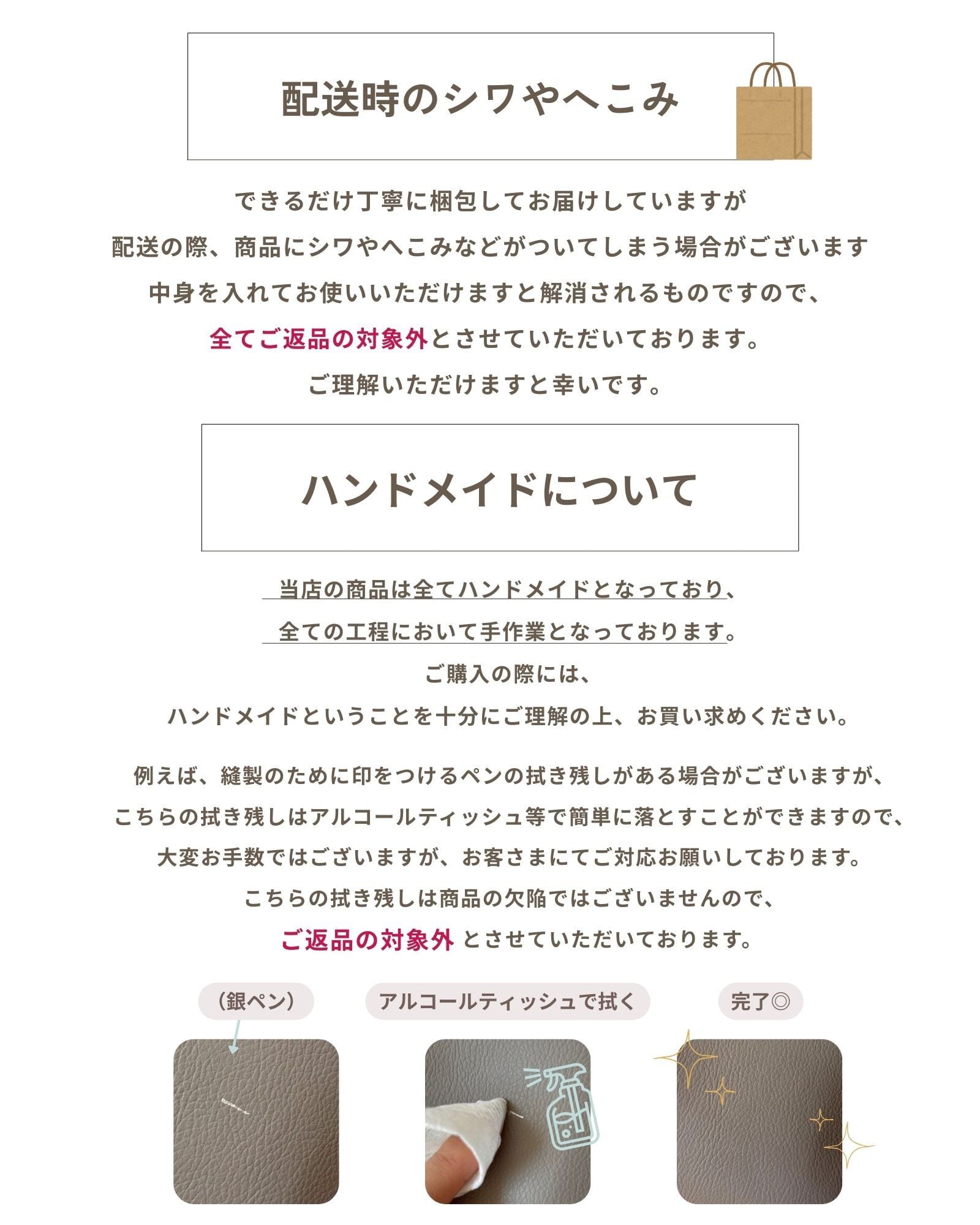 廃棄される生地をアップサイクルしていることとハンドメイドということを十分ご理解いただきご購入ください。配送中についたシワや凹みもご返品の対象外となります。万が一不備があった場合は商品到着後8日以内にご連絡くだされば事実確認の上で至急対応させていただきます。また、お客さまのご都合による交換等の際には、往復の送料と事務手数料のご負担をお願いしております。あらかじめご了承ください。