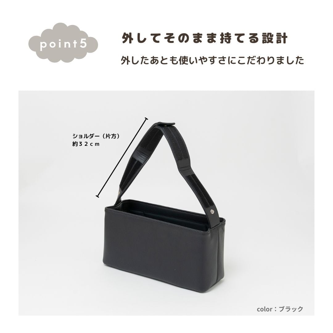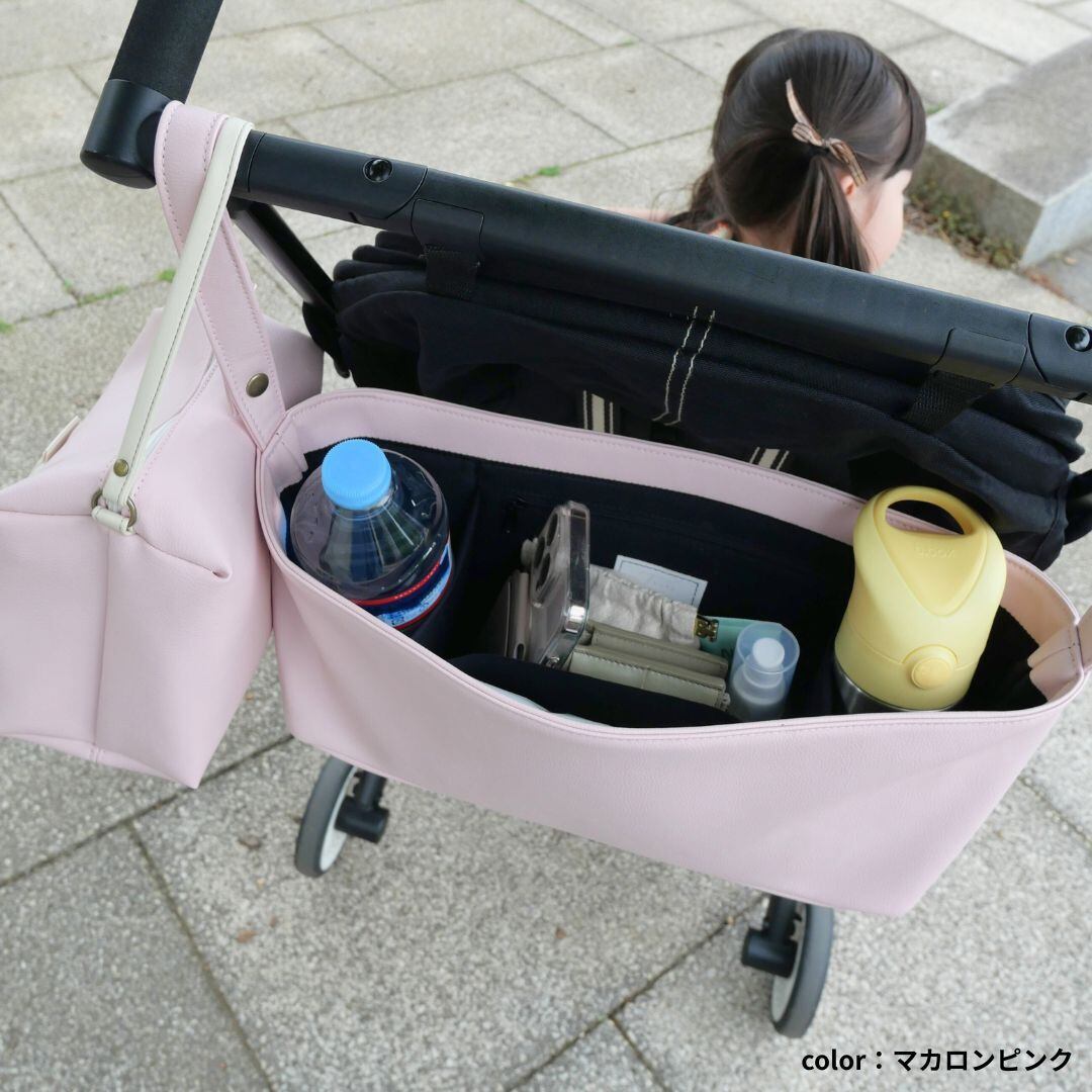中にはファスナーつきの収納ポケットや仕切りまであるのでベビーカーを押しながら、スマートフォンやドリンクなどをサッと取り出せます。大容量でシンプルで飽きの来ないデザインに仕上がりました。