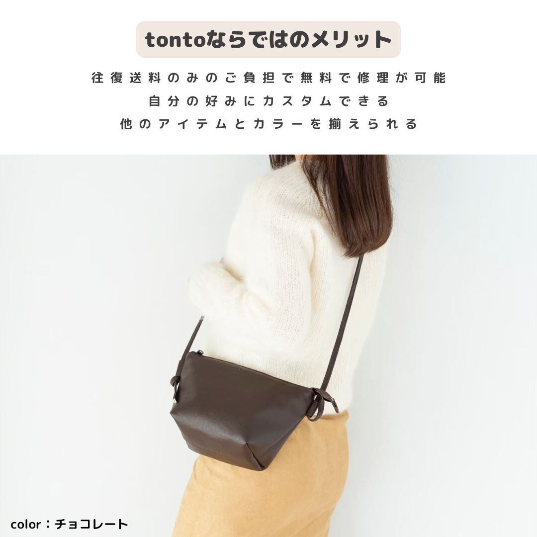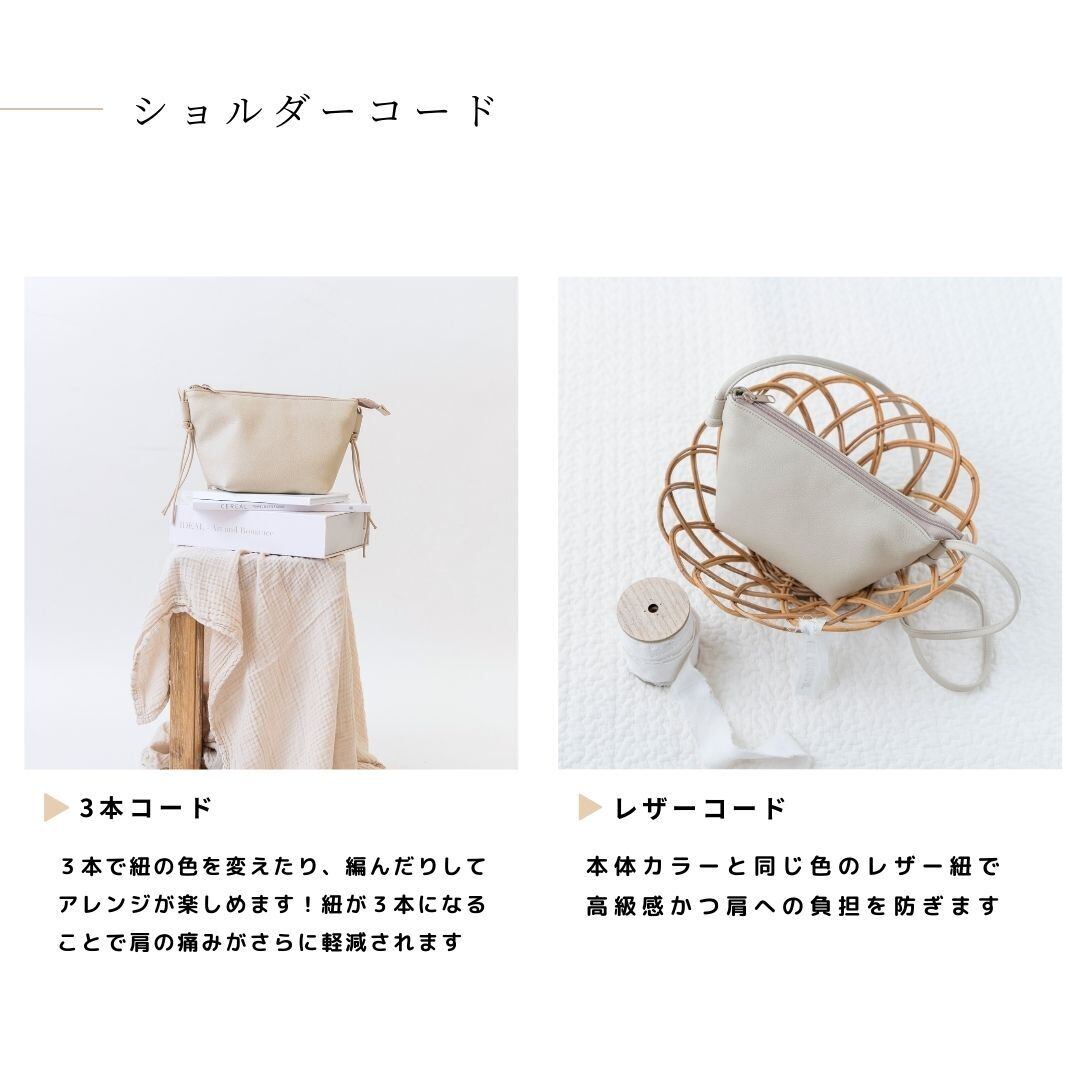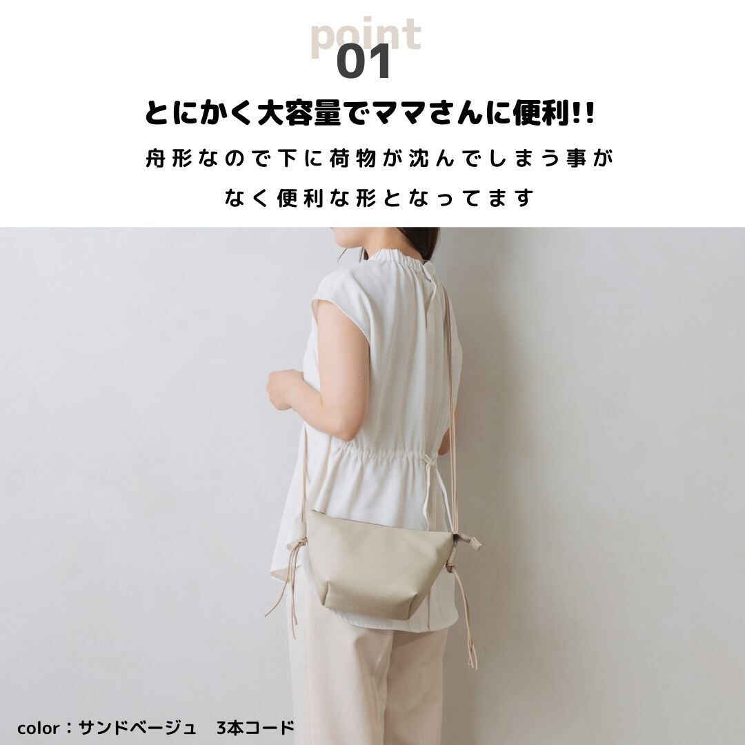 大容量で肩に負担のかからないようにレザー紐の使用にしました。