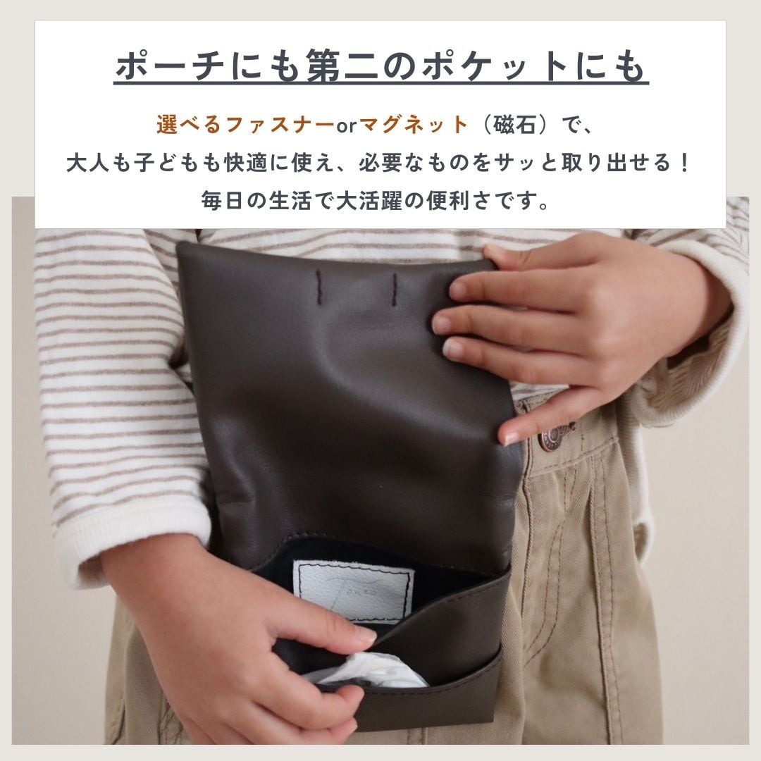 ポケットの中でクシャクシャになりがちなティッシュをしまえる、ティッシュ用ポケット付。最後の1枚まで綺麗にお使いいただけます。